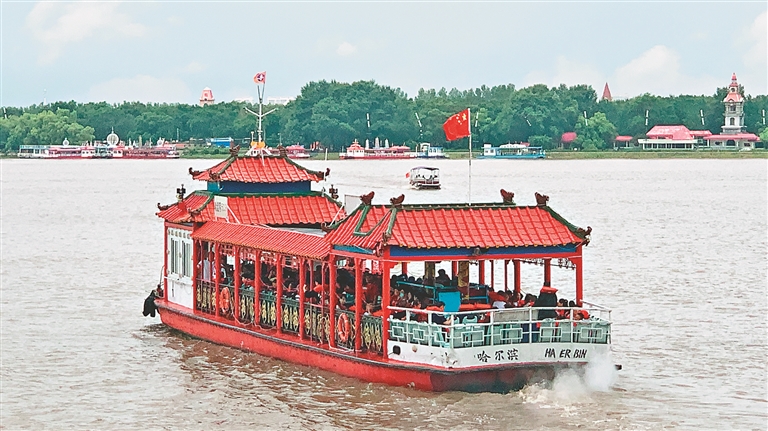 松花江畔满载游客的游船。