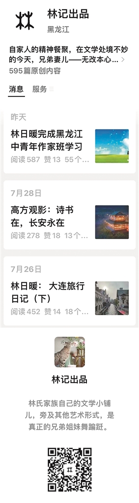 林家三代人的写作,背景跨越半个多世纪,写作背后的经历也大不相同,但他们都在用自己的笔记录时代的变化,从他们的文字中可以看到时代发展的日新月异。从年长者的往事追忆到十六七岁年轻人的校园记趣,从诗歌、散文、小说、评论,到歌唱和诵读,“林记出品”公众号就像一个小小的“杂货铺”,成为人人写作的最好典范。