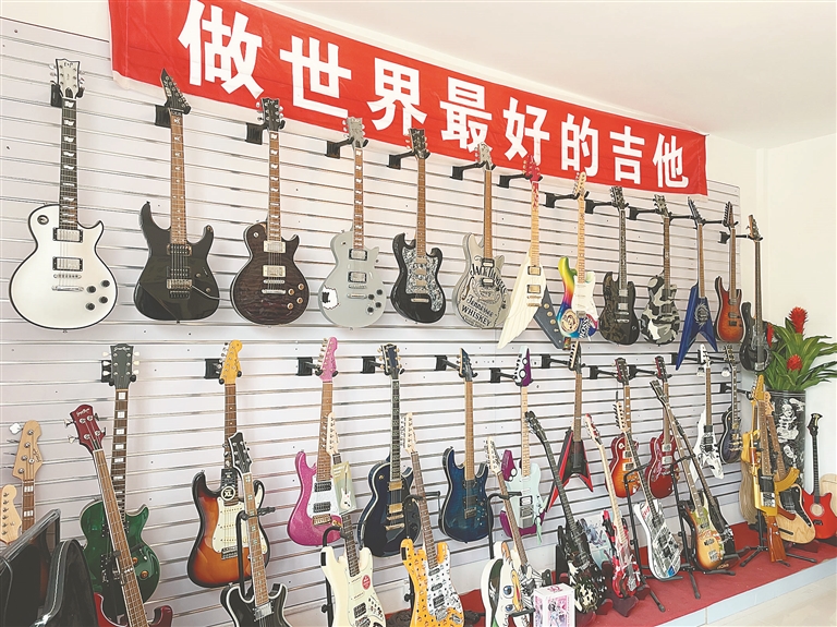 研发是企业的生命力所在。传统的电吉他要借助外接音箱达到演出的效果,能不能研发一种电吉他,不需要辅助设备就可以像民谣吉他那样发声呢?带着这样的想法,研发人员经过不断地讨论、反复地实验,终于用3年时间研发出了一款自带内置音箱的多功能电吉他。“这把多功能电吉他不仅可通过蓝牙与手机相连,还可以带上耳机实现静音练琴,方便初学者练琴。”吕传庚介绍。