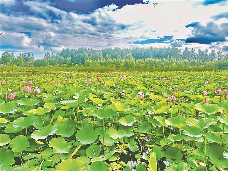 入夏以来,明水县明源街道城北村附近荷塘的满池荷花陆续开放,让城北村成为了远近闻名的打卡地。清风拂过,翠绿的荷叶轻轻荡漾,红白相间的荷花在荷叶的掩映下微微摇曳,有的含苞待放,有的悄然盛开,碧绿的荷叶宛如一柄精巧小伞。阵阵清香随风而来,令人心旷神怡,构成了一幅美丽的乡村画卷。