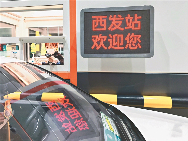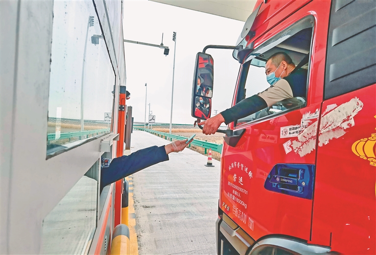 货车司机通过收费站。