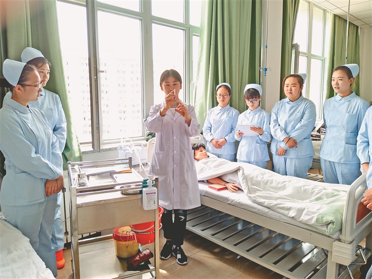 “在选择输液部位时,我们应对患者进行综合评估。大家思考一下,面对一位左侧前臂烧伤的患者,应该如何选择穿刺部位?”实验课上,护理实验教师杜晶晶正在用案例导入带领学生们进行模拟演练。