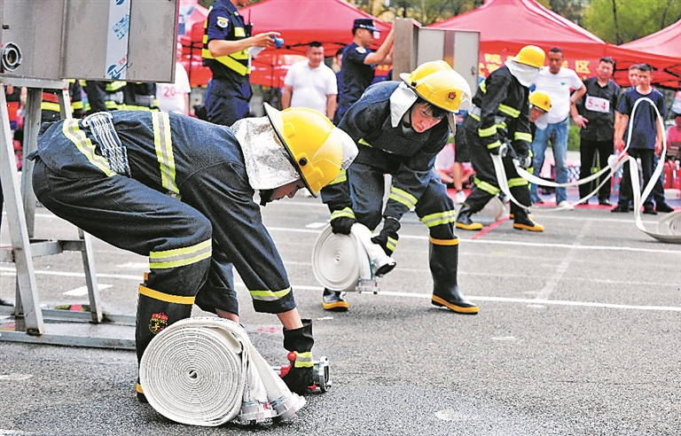 此次比武竞赛共分为三个比赛项目,在竞赛项目设置上贴近实战,包括单人原地穿戴灭火防护服、四人手提4kg干粉灭火器25米接力扑灭油盆火、两盘水带及水枪连接室内消火栓出水打靶。比武突出技能、团体、实战,考核和检验微型消防站队员的实战应用能力。