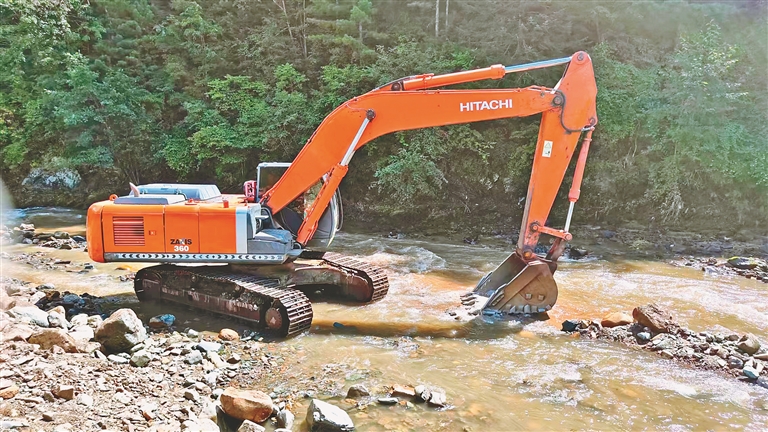 深一脚浅一脚,18日,记者紧紧跟随龙江森工海林局公司二十二林场职工王虎的脚步,穿越玉米地来到南大河岸边,这里一辆大型钩机正在紧张作业,疏通河道。