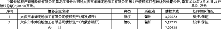 大庆市丰绅淀粉加工有限公司债权(浦发银行贷款),截至2023年 3 月 31 日债权金额共计 2,026.83万元,其中本金1,022.10万元, 利息745.23 万元,孳生利息259.50万元,贷款方式为抵押、保证。保证人翟士伟、邢桂娟。抵押物为房产,位于大庆肇州,用途为幼儿园,建筑面积4,181.28平方米、土地使用权4,310.8平方米,已办理抵押登记。抵押物正在使用,存在租赁、占用的情况。该项目已诉讼处于执行中。该债权资产存在债权、保证债权、抵押权难以实现的可能。
