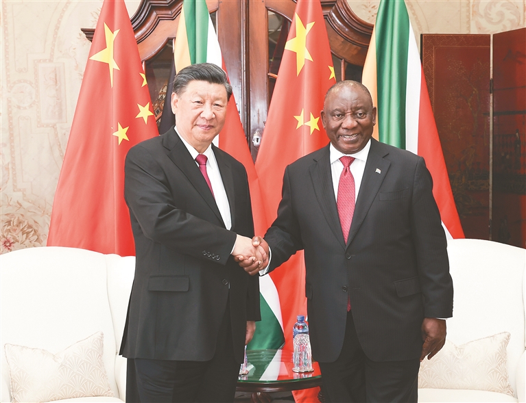 习近平指出,这是我第四次以中国国家主席身份访问南非。10年来,我亲历了中南关系的蓬勃发展。中南关系之所以好、中南友谊之所以深,关键在于两国两党在各自发展道路上休戚与共,结下了深厚友谊。当前,中国正在以中国式现代化全面推进中华民族伟大复兴,南非正在探索符合本国国情的现代化道路。中方愿同南方一道,传承友好、深化合作、加强协作,推动中南全面战略伙伴关系不断迈上新台阶,携手构建高水平中南命运共同体。