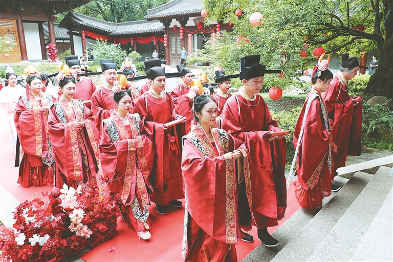 8对新人在福建省武夷山市参加武夷宫春秋馆举行的“朱子婚礼”。