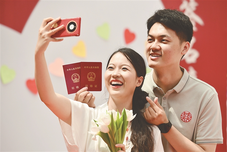 在安徽省阜阳市一对新人手持结婚证拍照留影。 图片均为新华社发