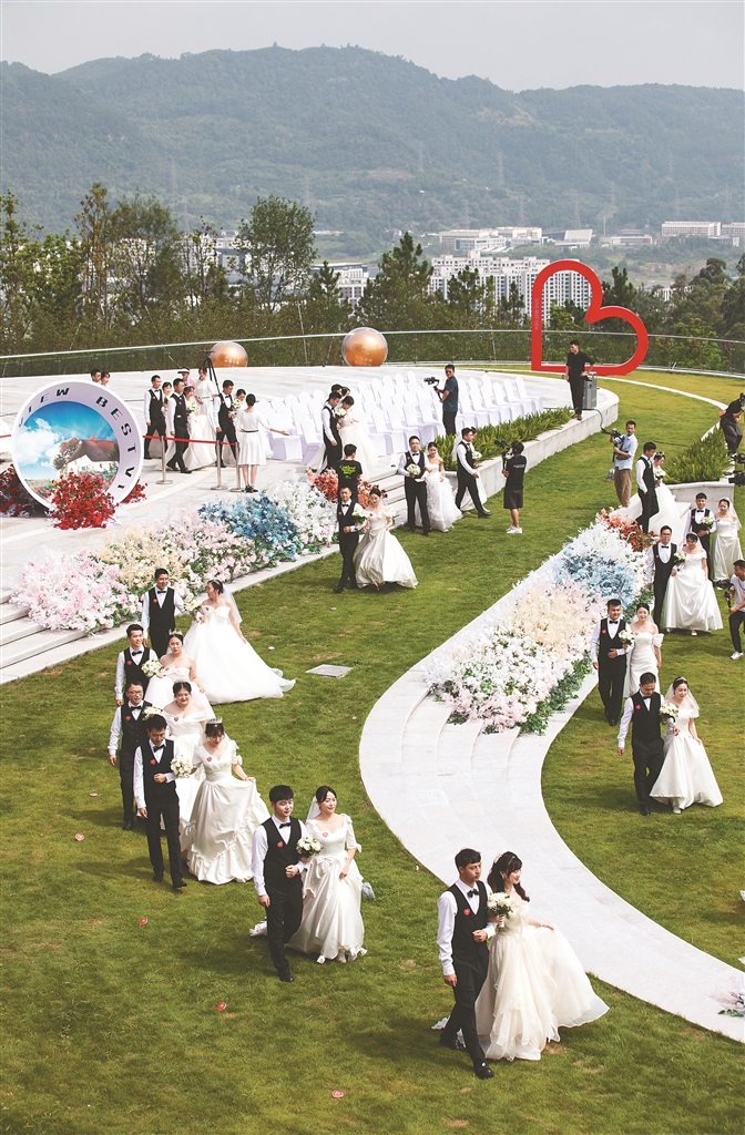 在四川省宜宾市新人列队来到三江新区“三江之眼”参加集体婚礼。