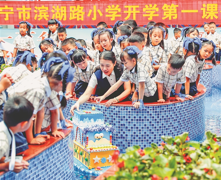 8月28日,南宁市滨湖路小学的学生们和校长谢小燕一起将学生自制的“梦想船”放入水中。 当日,广西南宁市滨湖路小学举行以“播种科学梦想”为主题的“开学第一课”暨科创节开幕式活动,通过科学情景剧、科学小实验、科学梦想分享等方式引导学生感受科学的魅力。