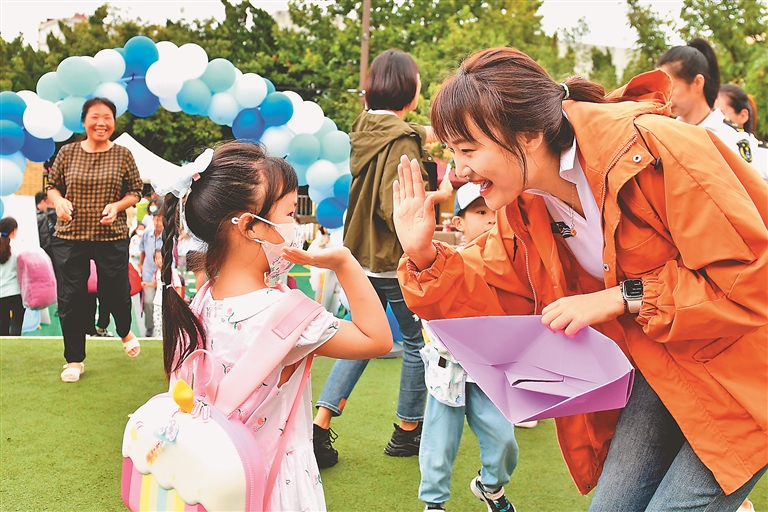 8月28日,在山东省青岛市市南区金钥匙幼儿园新学期开学迎接仪式上,一名小朋友与老师击掌致意。
