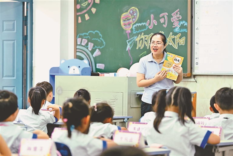 8月28日,广西柳州市德润小学一年级教师向新生讲解小学课本。 图片均由新华社发