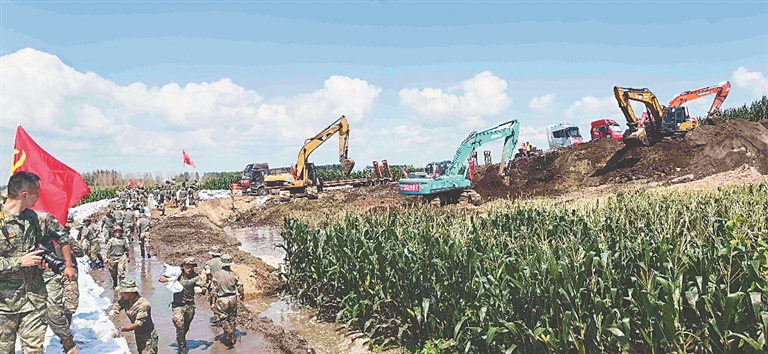 后方,6台挖掘机、3台铲车、20台四轮车隆隆作响,80名村民再鼓干劲,为垒坝大军备足沙土;前方,数百军人肩扛沙袋,疾步穿梭,“砌筑”沙袋墙。军民携手奋战了一天一宿。