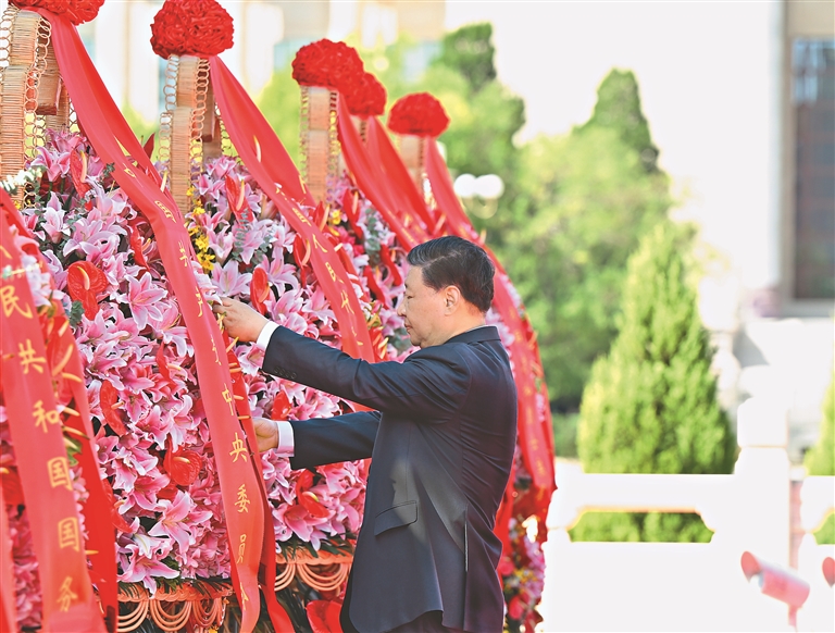 9月30日上午,党和国家领导人习近平、李强、赵乐际、王沪宁、蔡奇、丁薛祥、李希、韩正等来到北京天安门广场,出席烈士纪念日向人民英雄敬献花篮仪式。这是习近平整理花篮上的缎带。新华社记者 殷博古摄
