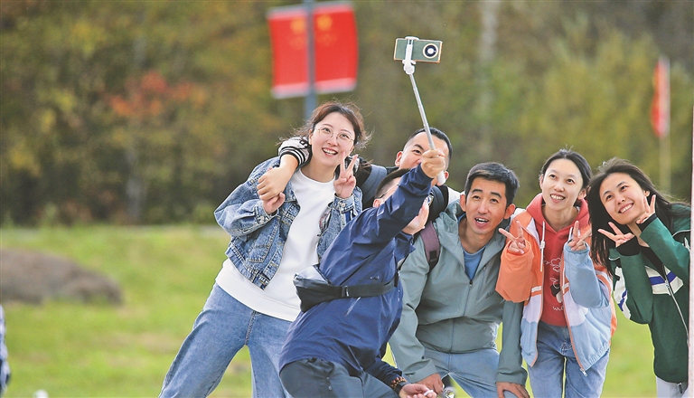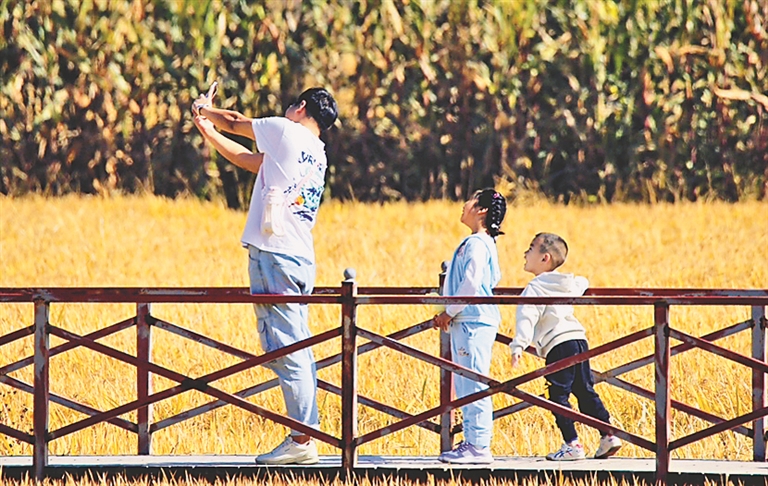 10月1日,在哈尔滨市阿城区的稻田公园,成熟的水稻灿若黄金,如画美景吸引来游客到此打卡拍照。市民高举手机,定格秋色美景下的精彩瞬间。 本报记者 张澍摄
