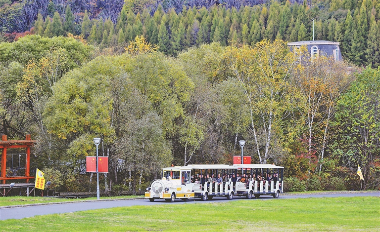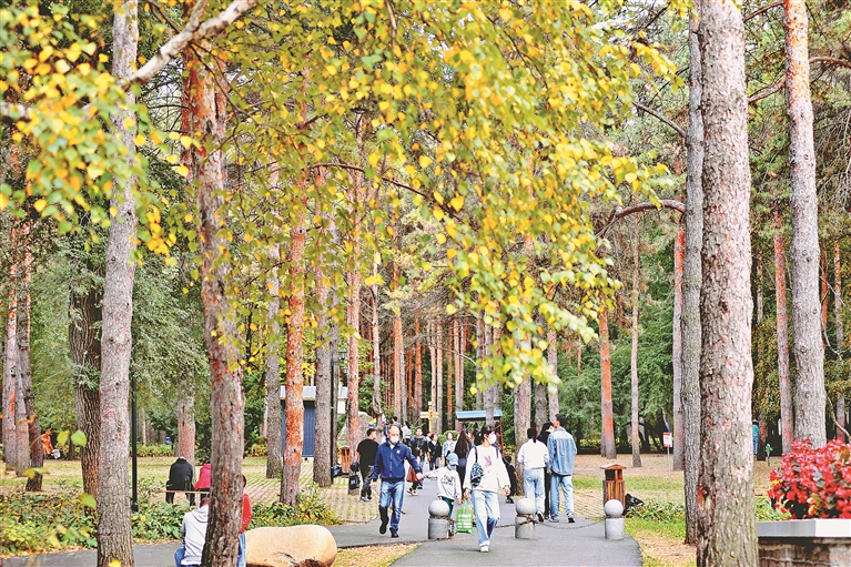 10月1日,哈尔滨市金龙山国家森林公园游人如织。山中的水曲柳、胡桃楸、榆树、白桦、蒙古栎、黑桦等林木,已被秋色晕染,五花山色悄然启幕,游人信步大森林里,宛如行走在一幅幅油画之中。 本报记者 张澍摄