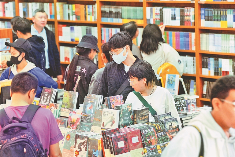 在哈尔滨市道里区中央书店,看书、买书的顾客比平时多了几倍,有家长带孩子来阅读儿童读物,也有许多成年人来选购图书。本报记者 苏强摄