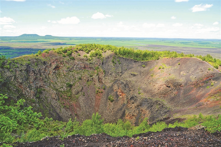 我站在火山口旁,环绕着盆边走了一圈,像一枚硕大的句号从起点圆到终点一样,一步便交汇到几千年地壳变迁的原点。我抚摸着矗立的“老黑山火山口”石碑,思绪随着当年火山喷发时的壮观景象而翻腾滚动起来。