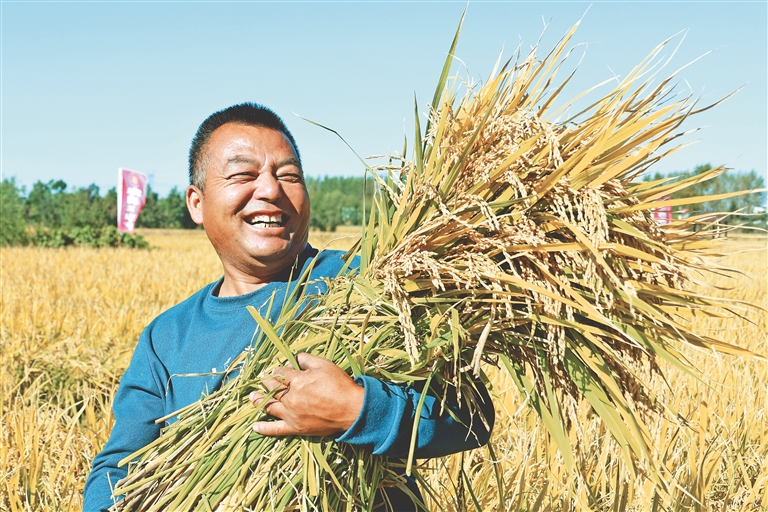 日前,绥化市北林区稻田公园的1000多亩生态水稻喜获丰收,农民怀抱稻子满脸丰收的喜悦。刘宪武摄
