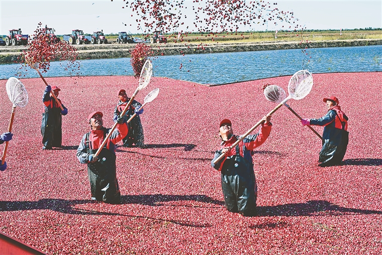 打果机开足马力在水中进行采收,很快一汪碧水就变成了红色海洋,果田中的水车、红果、波光与蓝天构成美丽画卷。果农们在欢声笑语中采摘收集蔓越莓,并用收获的果实制作了“庆丰收 促和美”图案,表达喜悦心情。