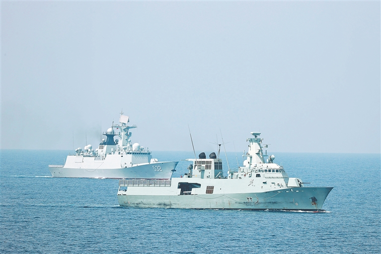 10月14日,中国海军第44批护航编队在阿曼马斯喀特附近海域与阿曼皇家海军舰艇进行编队运动演练。新华社发