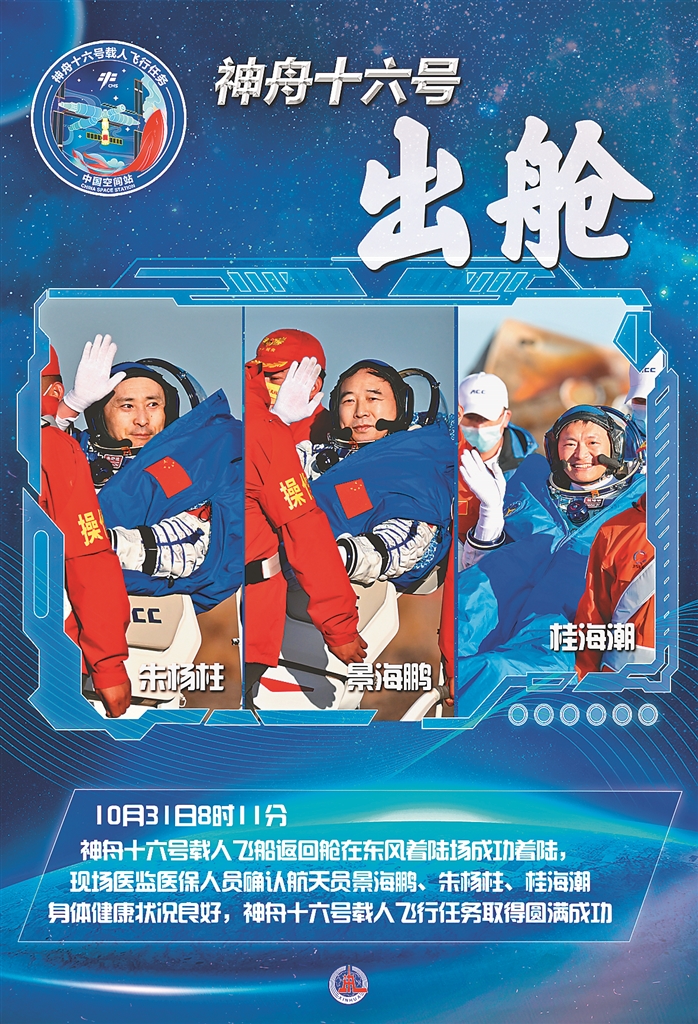 据新华社酒泉10月31日电 10月31日8时11分,神舟十六号载人飞船返回舱在东风着陆场成功着陆,现场医监医保人员确认航天员景海鹏、朱杨柱、桂海潮身体健康状况良好,神舟十六号载人飞行任务取得圆满成功。