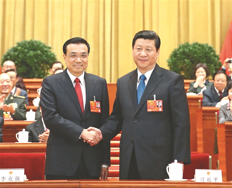 图①:2013年3月15日,第十二届全国人民代表大会第一次会议在北京人民大会堂举行第五次全体会议。会议经过投票表决,决定李克强为中华人民共和国国务院总理。这是习近平同志和李克强同志亲切握手。新华社记者 兰红光摄