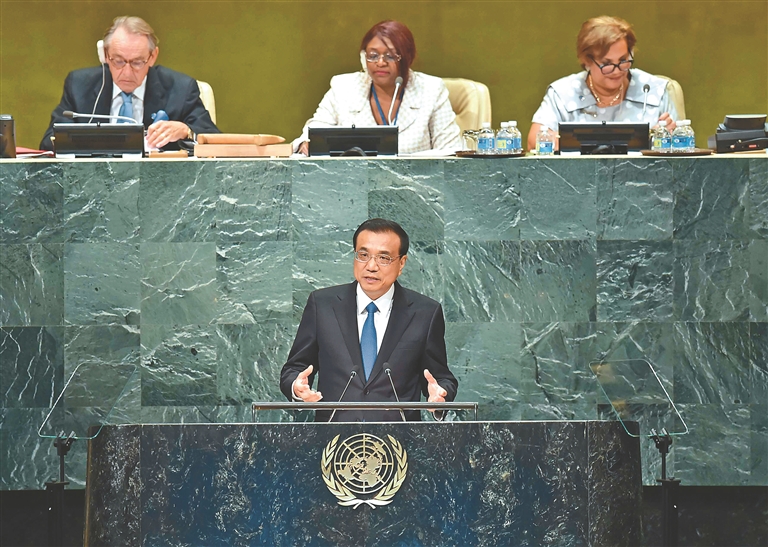 图⑾:2016年9月21日,李克强同志在纽约联合国总部出席第71届联合国大会以“可持续发展目标:共同努力改造我们的世界”为主题的一般性辩论并发表题为《携手建设和平稳定可持续发展的世界》的讲话。 新华社记者 李涛摄