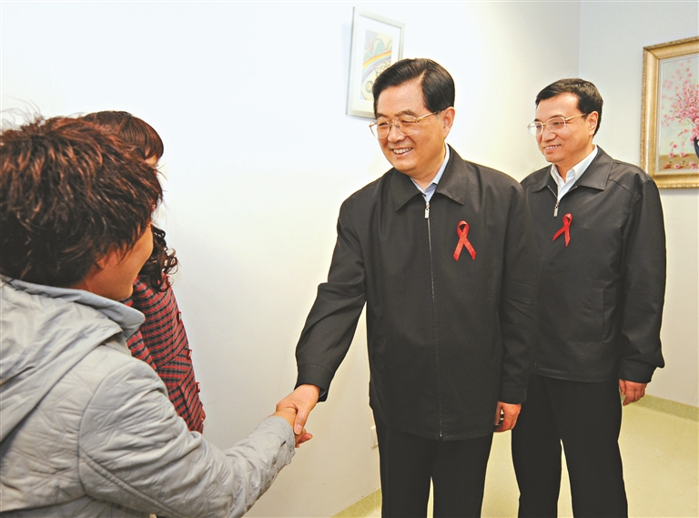 图③:2008年12月1日是第21个世界艾滋病日。胡锦涛同志和李克强同志来到北京地坛医院考察艾滋病防治工作。新华社记者 马占成摄