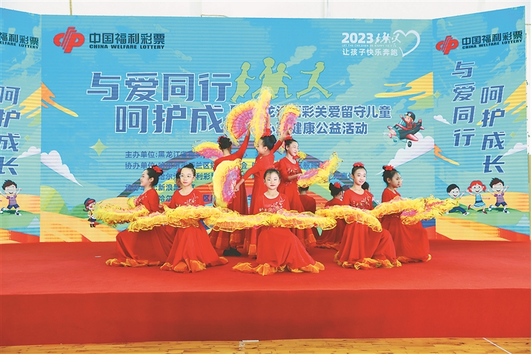 在启动仪式上,孩子们表演了扇子舞《歌唱祖国》、手语舞《感恩的心》,精彩的演出表达出了他们对祖国的热爱和对来自社会各界人士关心爱护的感谢。黑龙江省福利彩票发行中心向留守儿童发放了学习用品,孩子们也将自己制作的手工艺品送给参加活动的爱心人士。