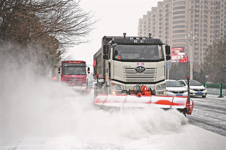 清雪,即下即扫|全省多地为迎战本轮强降雪,纷纷出动环卫工人与清雪车辆上街作业,及时保证道路畅通与行人出行安全。图为绥化市清雪车辆进行清雪作业。刘华鹏摄