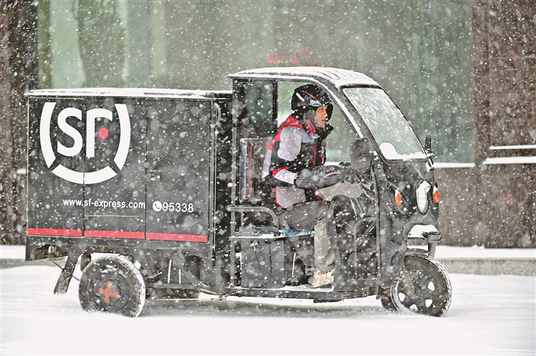 本轮强降雪中,顺丰快递小哥全员上岗,无一人因冰雪天气请假。图为快递小哥冒雪保证快递送达。 本报见习记者 张春雷摄