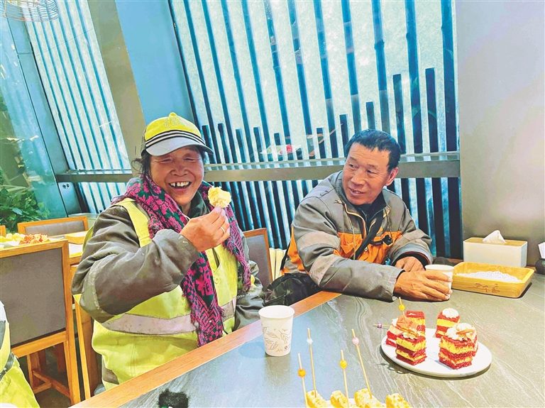 图为环卫工人在室内休息并品尝商家提供的小蛋糕。