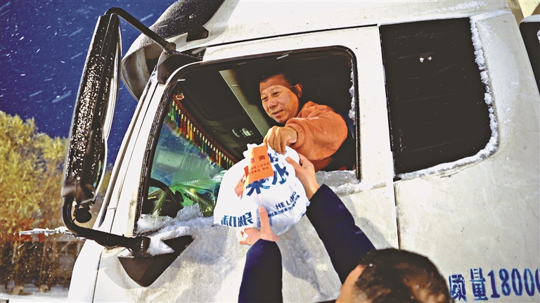 得知情况后,香坊区委区政府迅速组织区政府办公室、区农业农村局、区工科局和黎明街道、幸福镇、朝阳镇干部,分赴4个高速路口,为司乘人员送去香坊区政府食堂新做的热粥以及爱心企业和粮农业有限公司捐赠的自热盒饭,确保滞留车上人员温暖安全过夜。