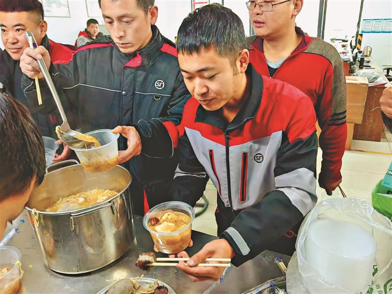 黑龙江顺丰快递小哥在此次降雪中全员上岗,确保快递准时送达。为加大对员工的关爱力度,黑龙江顺丰所有网点均准备了红枣姜糖水,以及火锅、铁锅炖菜等能够快速暖身的热乎饭菜,公司还为省内中转干线司机准备包括牛奶、面包、红肠等“暖心包”,确保司机无法下高速时可以解决餐食问题。