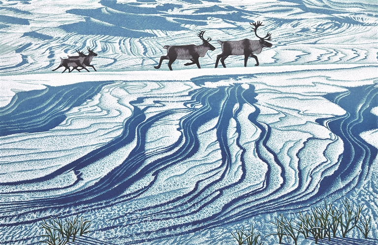 长松傲雪不知年,寒鹿依依别有天,这是版画家张士勤先生作品所描绘的冬日里大兴安岭独特的自然风光。
