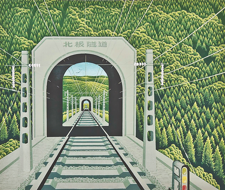 艺术创作让素材活和活素材,是反映了两种生命的态度,前者是实实在在的,强调这个活跃的氛围是在我的观照中的,是有我的生命观。后者则是无我,是在看的过程中建立我和世界的关系,是我让世界活。例如在《铁道兵丰碑》《铁道兵-永远的丰碑》作品中有兴安岭极具代表意义的历史丰碑等建筑,可以看出画家艺术底蕴的深厚,他善于运用几何形状的构图方式,选择某一物体作为贯穿整个画面的主结构线,对画面进行几何分割,使单一的空间产生大的节奏变化,通过遮挡将视线延伸,特别是背景的处理上,又为生硬的建筑带来鲜活的况味。在这系列作品中我们可以看到点、线、面、体、光、色、质等造型艺术元素的存在,而这些,就是他从生活到艺术的重要表现。