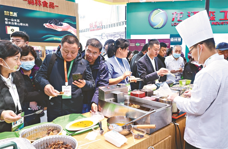在综合品鉴区,人头攒动,热闹非凡。森林食品集团旗下“森林好客”预制食品和亚布力局公司“惊哲”系列菜品凭借原生态、无污染、非转基因等特点深受广大市民喜爱。“一般的猪肉吃起来有点绵,这个猪肉吃起来咬劲很弹。”参展客商边品尝边点赞。