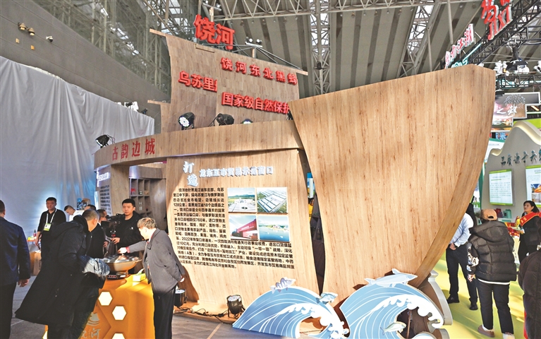 饶河县的展位突出了“乌苏里船歌诞生地”的主题,以“中式三帆宝船”的形象为造型。展区设计独具匠心、别出心裁,紧紧结合了饶河县独特的地缘优势和产业特色,吸引了众多参展客商参观。