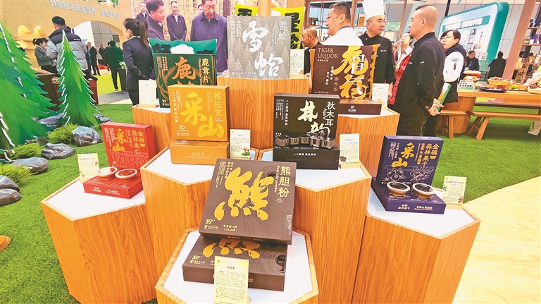 若说今年博览会最为吸睛的展区有哪些,“九珍十八品”展区绝对名列其中。红松籽、榛子、刺五加、毛尖蘑,一排排琳琅满目的林下特产;“虎虎生威”“林海蛙鸣”一道道由森林食材制成的精美菜肴;“熊胆粉”“鹿茸片”“雪蛤”等包装精美的伴手礼及风格雅致的文创产品,让到场来宾一次性体会到何为“广袤大森林,遍地都是宝。”