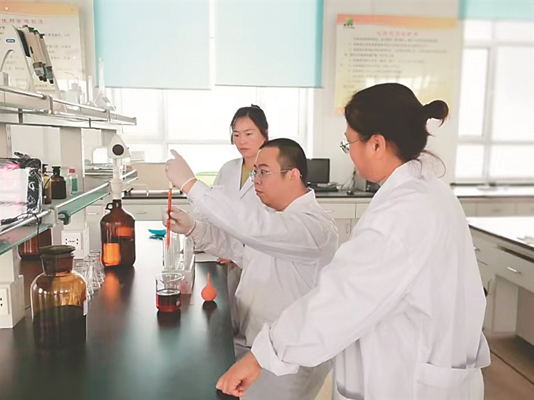 化验员刘洪陈用手里的吸管从瓶子里吸入浸提液,慢慢地滴入到面前排列的试管中,随着试剂缓缓地滴入管中,数值的变化也呈现出来。