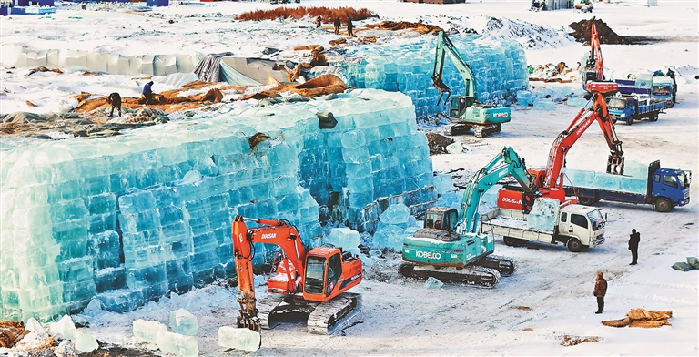 11月23日,哈尔滨冰雪大世界储冰场开始“出冰”。储存冰厚厚的“被子”被工人打开,多台钩机把一块块晶莹剔透的冰块运到货车上。装满冰块的车辆驶进不远处的园区,一车车卸载主塔旁边。这些冰块,将率先用在主塔的建设中。