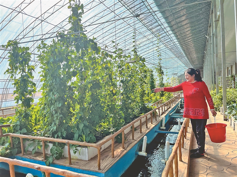 据刘瑞成介绍,为全面落实化肥农药“双减”政策,加快生态农场和低碳乡村建设,深入推进产业生态化和生态产业化融合发展,他带领村委会成员、村里企业和村民代表到全国各地考察后确定引进了“鱼菜共生”项目。在该项目中,鱼产生的粪便可转化为肥料,为蔬菜提供养料,避免化肥农药投入;同时,蔬菜根部水分再循环到鱼塘,实现节约用水、绿色种植;温室大棚采用“海容模块”技术,有效增加大棚保温性,既节约采暖成本又实现减碳降碳。从2022年项目一期建成投用以来效果良好,年可生产绿色蔬菜7万公斤、鲜鱼4.5万公斤,年产值达470万元。目前,正在全力推进二期减碳式生态观光餐厅的建设,待项目全部建成投产后,可年产蔬菜100万吨、水产品68万吨,产值可达7000万元。
