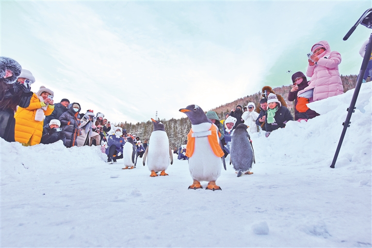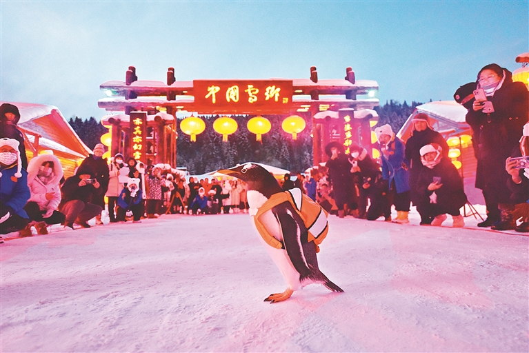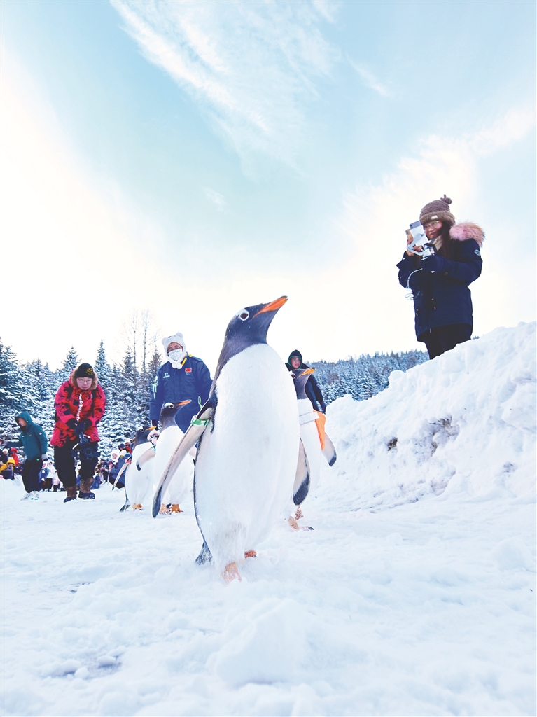 来自天南海北的游客难掩兴奋,“太可爱了,就像一群小朋友,从头到脚都萌萌的,尤其是那焦黄焦黄的小爪子,肉嘟嘟的。”“企鹅背包里是啥啊?是不是黄钻红钻和绿钻?拉开我看看。”“前几天我们刚在建筑艺术广场偶遇企鹅,今天又在雪乡碰面了,啥也不说了,缘分。”沿着“哈亚雪”旅游线,“淘学企鹅”下一站将前往亚布力,和大熊猫思嘉重逢。