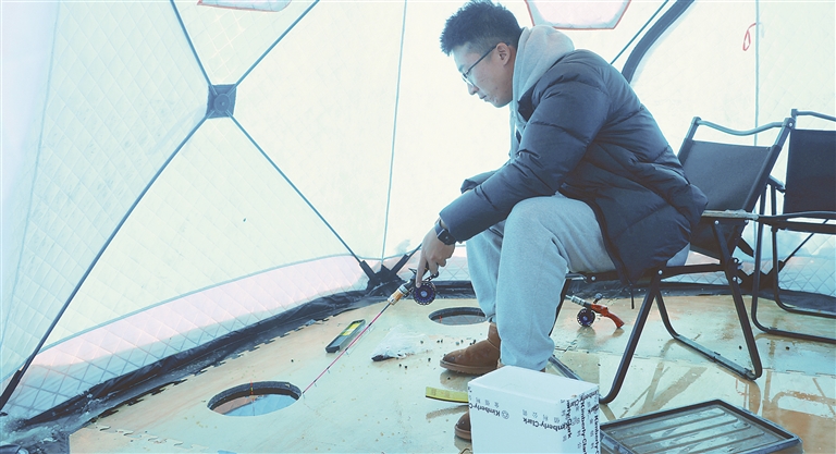 白鹭岛附近的冰面上已经搭好了几十顶帐篷,这种专业的冰钓帐篷,保暖性极佳,防寒设施一应俱全。点上燃气炉,帐篷内温度超过20℃。钓友们坐在椅子上,拿着小手竿,其乐融融地拽出一条条花羔红点鲑、哲罗鲑、细鳞鲑等冷水鱼。