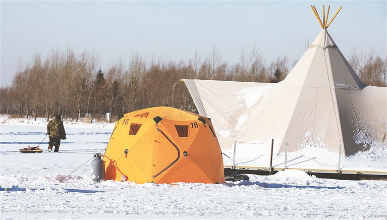 11月25日,在呼兰河口湿地,多位钓鱼人走上冰面,坐进帐篷里,开始今冬的第一场冰钓。