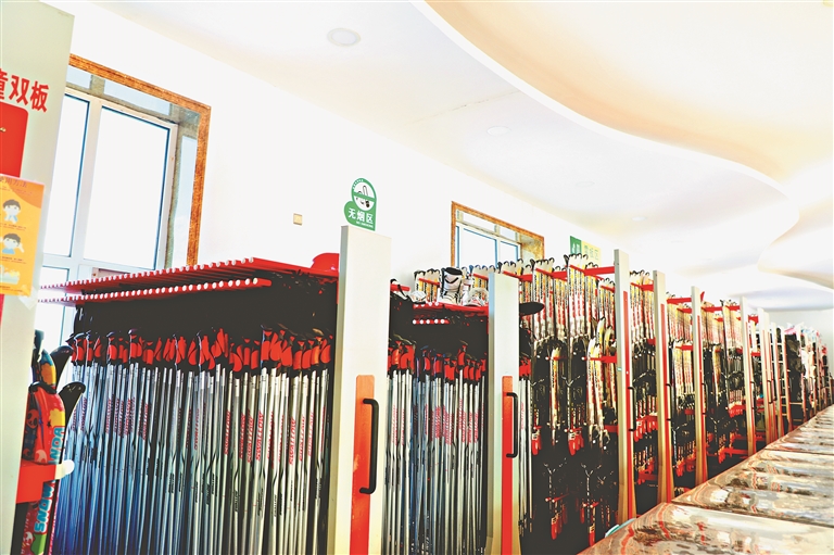 雪具大厅内,琳琅满目的滑雪装备已经摆放整齐;滑雪场上,雪炮轰鸣、雪雾飞舞,2台造雪机械同步运转。