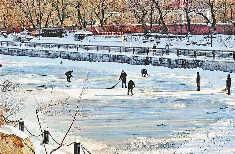 他们用扫帚将冰面的积雪清扫干净,用铲子除去冰层表面的冰包、冰棱,再往冰面上浇上一桶桶水,让冰面变得更加平整光滑。