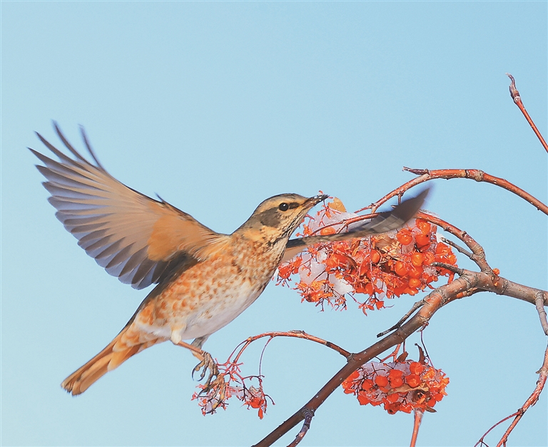 近日,在牡丹江市北山公园内,下雪的日子里,山是白的,树是白的,只有那一串串花楸果,顶着一撮白雪,给这洁白的世界点点红色。远看似万朵红梅,近看如无数的红酒杯。鲜艳的花楸果吸引了无数的小鸟,叽叽喳喳,上下翻飞,翩翩起舞,让寂静的冬日世界热闹起来。