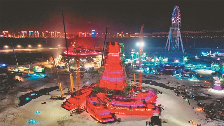 本报讯(记者刘艳)经过冰建工人们争分夺秒昼夜奋战,4日21时18分,第二十五届哈尔滨冰雪大世界园区主塔“冰雪之冠”封顶,进入最后的细节打磨和灯光调试阶段,即将惊艳亮相。